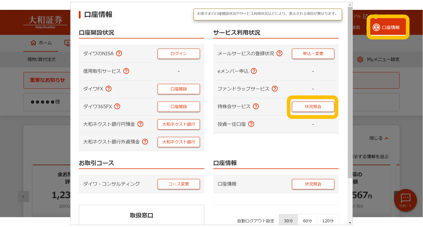 ダイワのオンライントレードにログインし、画面右上の「口座情報」から、「サービス利用状況」欄にある「持株会サービス」の「状況照会」をクリックします。